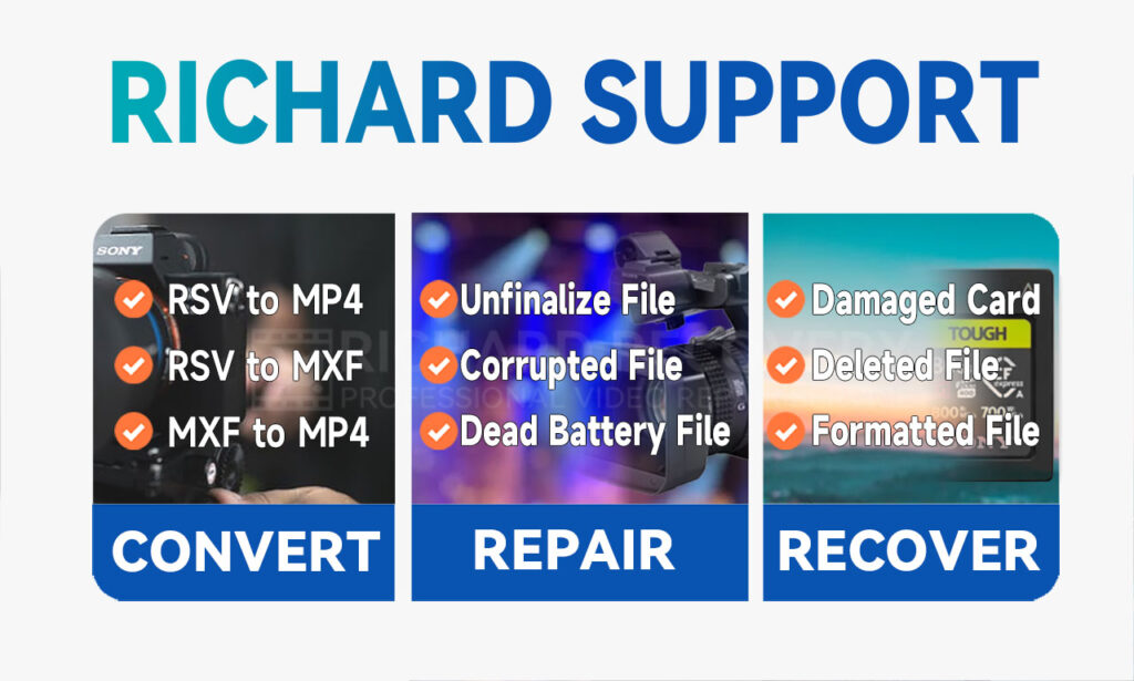 Richard Recovery focuses on video repair, we have in-depth research on the video encoding of all Sony cameras and camcorders. We supports repair damaged file after abnormal interruptions such as power issue or crashes, such as RSV, MP4 or MXF video formats. If you need online video repair services, you can directly contact us.